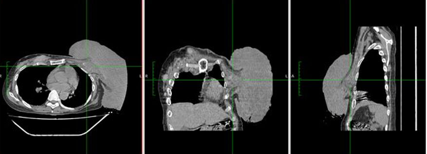 The patient was received with stable vital signs, and with good functional status. On physical examination, there is a violaceous, fungating, friable mass around 35 × 25 × 8 cm (L × W × H), with multiple points of bleeding at the left breast. No palpable nodes on bilateral axilla, clavicular, and cervical areas noted (Figure 1).