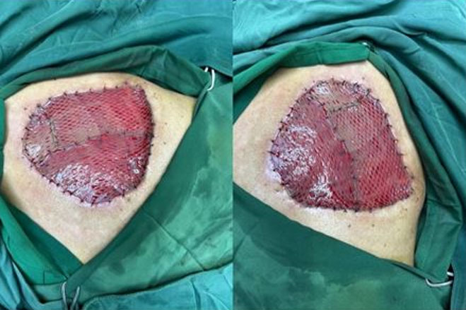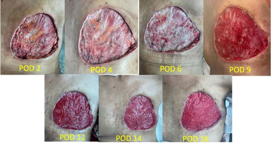 After isolation and optimization, the patient then underwent wide excision (total mastectomy), left with en bloc resection of pectoralis major with delayed reconstruction (Figure 5). Post-mastectomy defect was initially managed with wet to dry dressing with addition of Microdacyn® spray. Initial cultures of the wound bed revealed growth of different species and appropriate antibiotics were given. On the 13th post-operative day, cultures yielded no pathogen growth, and wound bed was noted to have good granulation (Figure 6).