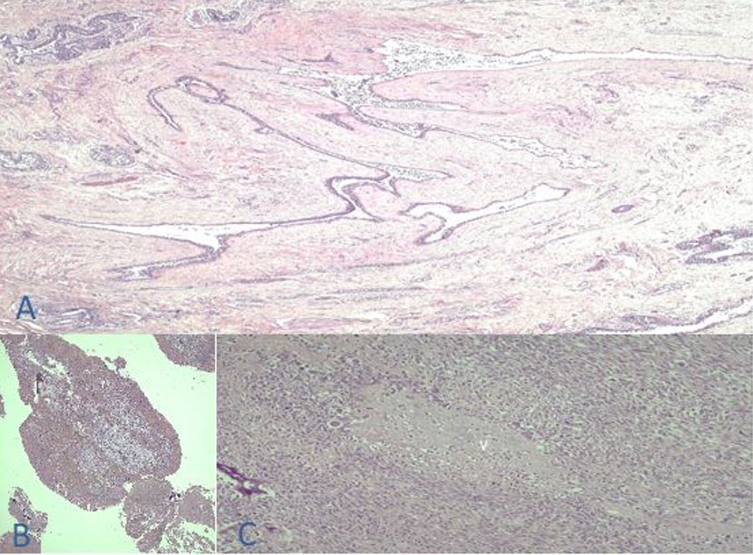 On gross examination, phyllodes tumor forms a well-circumscribed, firm, protruding, or fungating mass. On cut section, mass shows tan or pink to gray areas with fleshy and mucoid regions. On microscopy, exhibits an enhanced intracanalicular growth pattern with cleft-like spaces lined by epithelial and myoepithelial cells and hypercellular stroma, giving rise to its characteristic “leaf-like pattern” [1].