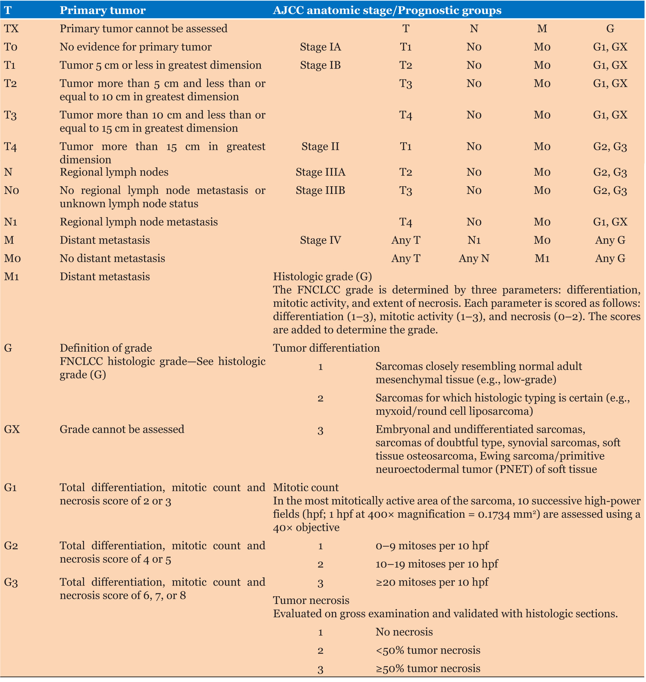 Malignant phyllodes tumor behaves more similarly to soft tissue sarcoma rather than to other breast cancers; hence, the staging follows that for soft tissue sarcoma of the trunk/body wall and extremity (Table 2). The patient in this case is a stage IIIB (T4N0M0 G3)—T4 lesion, the mass being 30 cm, N0 and M0. Histologic grade is G3 with a score of at least 6-mitotic count of 24–26/hpf, and more than 50% gross necrosis.