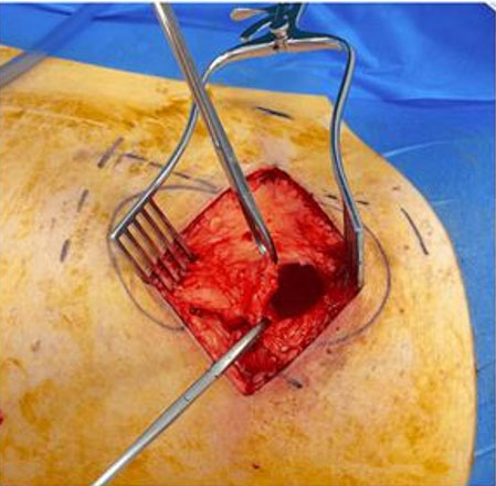 The hernia site was marked preoperatively with the patient standing (Figure 2). General anesthetic was administered. The patient was placed in the left lateral position and the bed broken to widen the 12th rib and iliac crest distance. An incision was made parallel and superior the right iliac crest. With retraction and dissection, the defect was located. The edges of the hernial defect were defined with retraction and dissection in a circumferential fashion. The pre-peritoneal space was entered, and a large pocket created with a combination of blunt and sharp dissection. The peritoneum and pre-peritoneum were separated widely across the iliac blade and muscles anterior and posterior (Figure 3). A bard Ventrio hernia mesh (11×14 cm) was placed in the pre-peritoneal space with at least 5 cm overlap (Figure 4). The mesh was secured inferiorly with endo tackers to the iliac blade. The wound was closed in layers including the defect. No drain was placed.