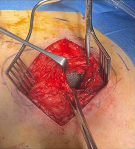 The procedure was performed in identical fashion as the previous patient; however, a smaller-sized mesh was used (Figure 6, Figure 7, Figure 8). Both patients had an uneventful recovery and were discharged the following day. On subsequent follow-up, there were no surgical issues.
