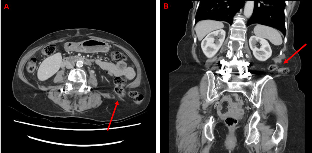 On clinical examination, the patient had a completely reducible left lumbar hernia. The diagnosis was subsequently confirmed on CT abdomen, pelvis demonstrating a left sided inferior lumbar hernia measuring 41 mm × 33 mm containing unobstructed descending colon and omentum (Figure 5A and Figure 5B). The patient was therefore booked for an urgent repair due to high risk of strangulation and subsequent morbidity.