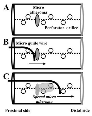 In the present case, the mechanism of ischemia has never been proved exactly. The proposed transient ischemic mode is still under discussion. The dynamic change of microperfusion through brain stem perforator is difficult to analyze. In addition, it is difficult to detect the minute length of microatheroma shift or spread on the arterial intima in a clinical manner. Basic research would be needed to estimate the microatheroma dynamics by microguidewire stress. Further accumulation of clinical knowledge and experience of similar stroke should be needed to establish the “spread butter effect” hypothesis. It is necessary to continue the careful neurological adverse event control and radiological image argumentation on the catheter intervention cases to verify this hypothesis.