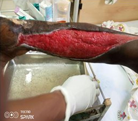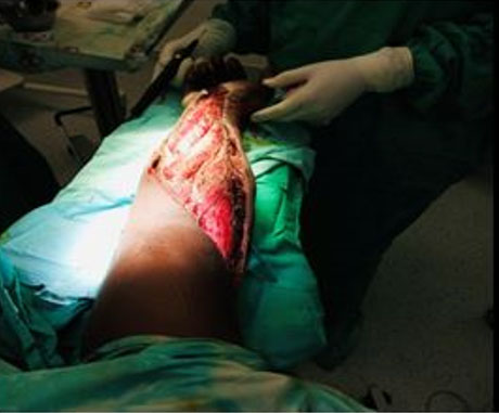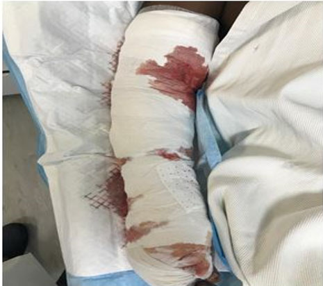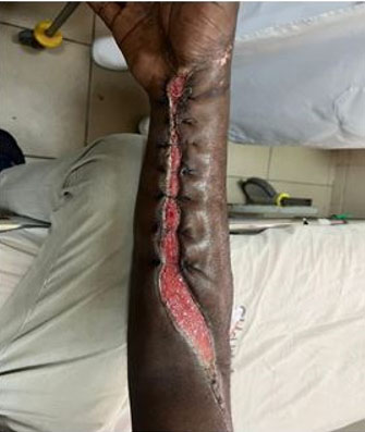 Upon admission, the patient had a Glasgow score of 15 points, reporting pain of 8 points on the numerical pain scale across the entire length of the right upper limb (RUL). On objective examination, distal cyanosis of the right upper limb was highlighted absence of brachial, radial and ulnar pulses. Functional impotence of all fingers, could not perform flexion or extension movements of the fingers, along with increased volume of the right upper limb extending from the distal end to the middle 1/3 of the arm, a bleeding point on the medial surface of the thumb, and pain upon palpation (Figure 3 and Figure 4). Evaluated by a surgeon who decided to take the patient to the operating room, where an enlarged fasciotomy was performed on the right forearm, passing through the skin, subcutaneous cellular tissue (SCT) to the palmar fascia, with control of hemostasis, extensive washing with hydrogen peroxide and physiological saline solution (Figure 5 and Figure 6).