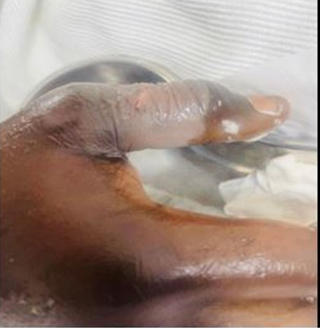 A 42-year-old black man, employee of the prison services of Calumbo (Province of Bengo), who was the victim of a snake bite identified by photography (Figure 2) (Bitis arietans) on the back of his right hand between the thumb and index finger, at around 7:00 pm on 09/15/2022, with an initial medical approach at Hospital do Bengo, where volume replacement was performed with 0.9% saline solution and subsequently transferred to the emergency department of the Main Military Hospital where he arrived at around from 9 p.m.