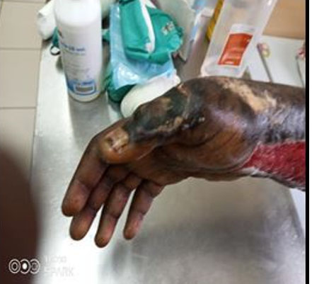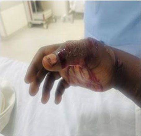 Bitis arietans venom increases vascular permeability to proteins and red blood cells, mainly in the splanchnic regions, leading to hypovolemic shock and death. Our patient also presented severe edema of the upper arm and right hemithorax due to increased vascular permeability and required a large volume of fluid infusion to maintain circulation, as well as fasciotomy and debridement due to the compartment syndrome he presented. Despite the necrosis that the thumb presented, debridements were carried out in order to avoid amputation of the finger. In one of the cases reported by Gras and his team [8], a 13-year-old boy bitten by Bitis arietans had an unfavorable local evolution with the necrosis progressing to the hand, requiring amputation and eight surgeries.