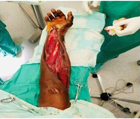 Introduction: Snake bite poisoning is a serious medical condition and a frequent medical-surgical emergency, which primarily affects rural communities in Africa, Latin America, Asia, and New Guinea. Throughout Southern and Eastern Africa, Bitis arietans is responsible for the majority of cases of serious poisoning and death. This article aims to present the first published clinical case that occurred in Angola regarding compartment syndrome caused by a Bitis arietans bite.