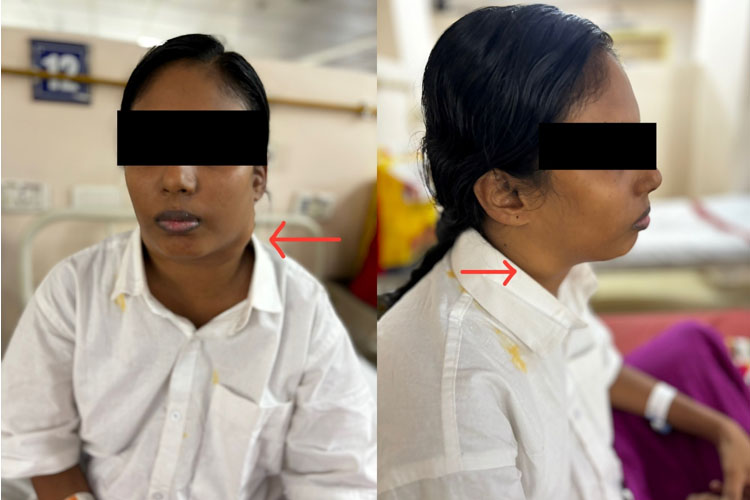 A 27-year-old multigravida at 26 plus 5 weeks period of gestation (POG) with a previous cesarean section was referred to our outpatient department (OPD). She had swelling in the neck region for the past one and a half years. The swelling was noticed after her first childbirth in 2022. She had been empirically treated with anti-tubercular therapy (ATT) for nine months. However, her symptoms had not subsided. She had no complaints of fever, malaise, or night sweats during the presentation. There was no contact with tuberculosis.
