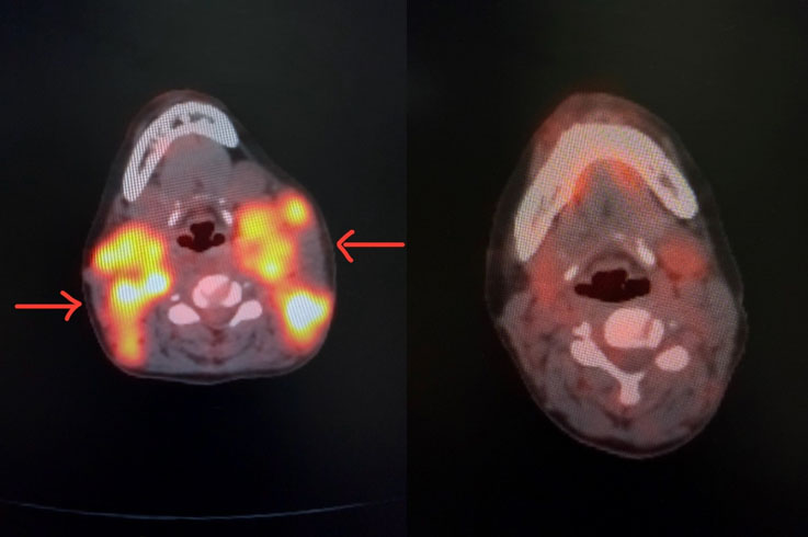 The patient was on regular follow-up in medical oncology and obstetric departments. At 36 +5 weeks of gestation, the patient was admitted for elective cesarean section because of a previous section with fetal growth restriction with oligohydramnios, and a cesarean section was done at 37 weeks. An alive female baby weighing 2.1 kilograms with APGAR 8 and 10 was delivered. The intraoperative period was uneventful, and the patient recovered completely. Positron emission tomography-computed tomography (PET-CT) done in the postpartum period revealed no progression in lesions compared to the previous magnetic resonance imaging (MRI). One-week post-surgery chemotherapy was started (ABVD—Adriamycin, Bleomycin, Vinblastine, Dacarbazine), and the patient was discharged on postoperative day 8 with allopurinol and low molecular weight heparin for postpartum thromboprophylaxis. Currently, she has received five cycles of chemotherapy, and the recent PET-CT showed 80% resolution of the lesion compared to pre-chemotherapy (Figure 2). She is planning for further cycles of chemotherapy. The baby is 5 months old and weighs 5 kilograms, with normal milestone development.